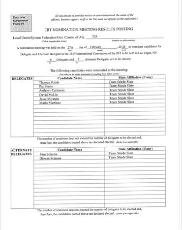 Nominations for Teamsters Local 703 were held and we are proud to officially announce our elected Delegates to the 2026 Teamsters Convention: